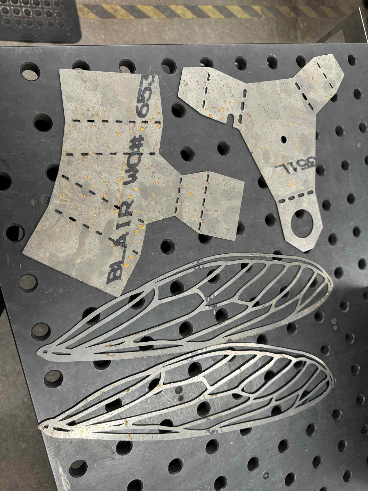 For the legs, I used a 1/4" solid steel tube, bent with a small tube bender and welded to the body. I fabricated the face by welding two large cap nuts onto a short cylindrical section of steel, then attached it to the base. Finally, I bent and welded on the wings, completing the form.