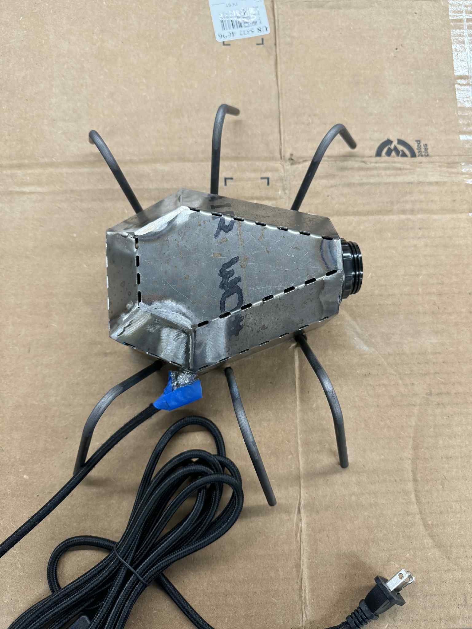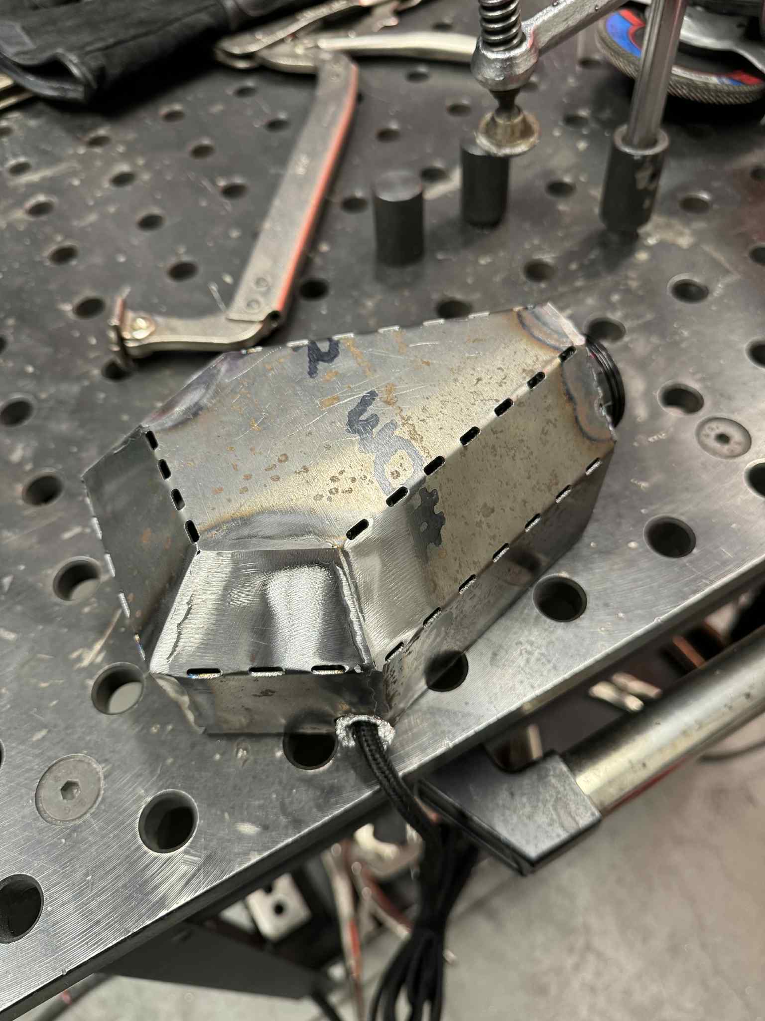 Welding the body was tricky because I had to weld it with the electronics inside. I had to blow compressed air into the body intermittently to prevent the lightbulb housing from melting, and I tried to shield it using tin foil. I then angle ground all of the edges flat.