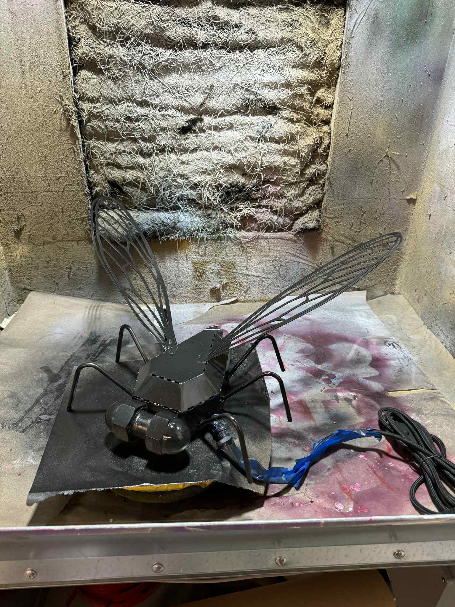After everything was welded and angle ground, I spray painted the whole thing black, then hot glued paper to the wings to give them some depth.