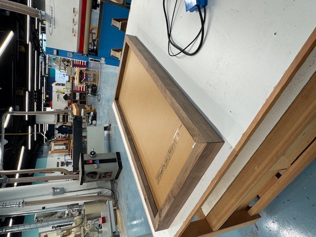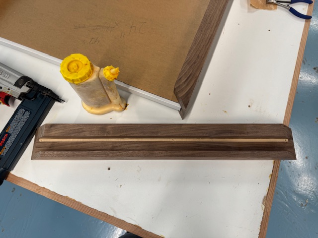 I created the frame myself out of solid walnut, with a separate box to the side to hold the light switch. This project used most tools in the wood shop, including the planar, joiner, miter saw, table saw, drum sander, nail gun, bandsaw, and domino joiner. The procedure I followed was practically the same as any other standard frame, except I needed to split the top piece in half to allow the acrylic piece to slide through the gap, as I wanted to be able to remove the acrylic pieces so I could modify the states as I visited more places.