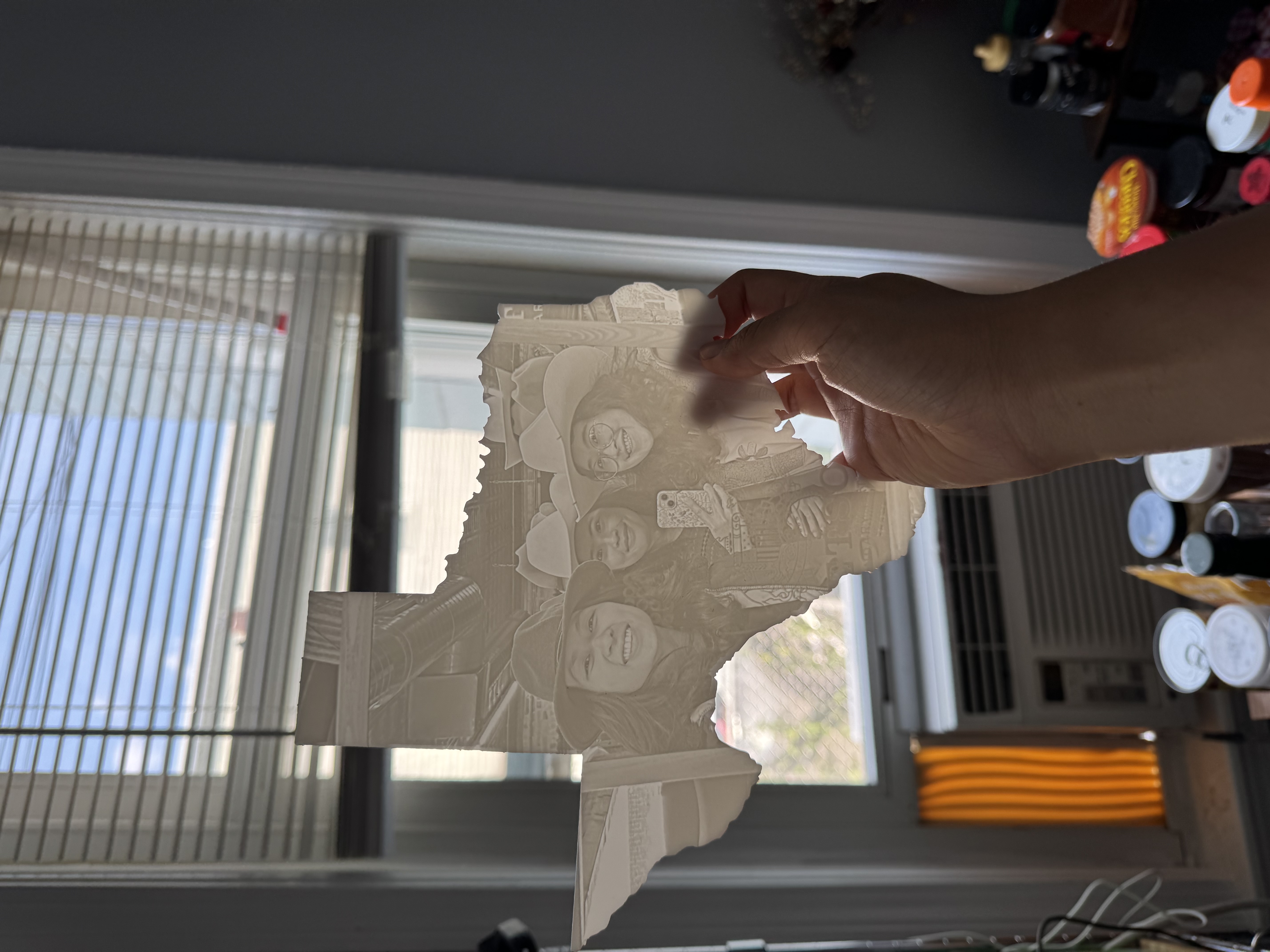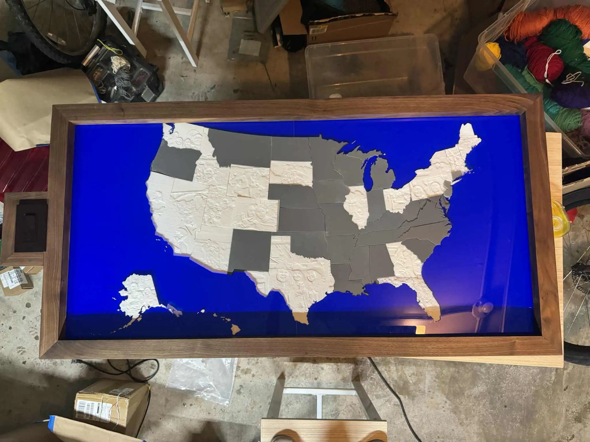 In this project, I made a map of the U.S. where each state is a different 3D-printed piece. States I've visited are each lithophanes of a picture I took there, while states I haven’t yet visited are a flat grey. The 3D-printed pieces are mounted on a 2’x4’ LED panel so the images show clearly.