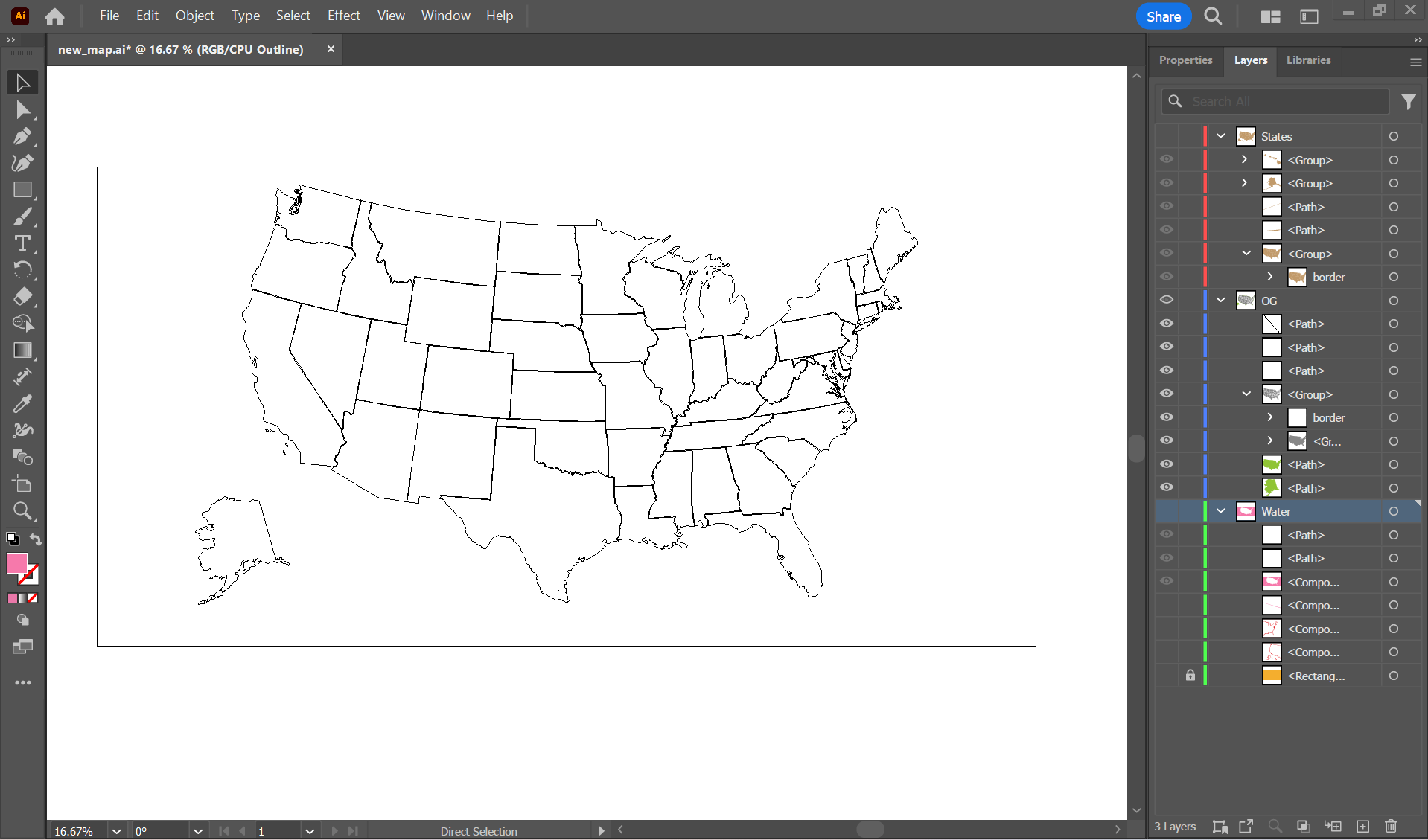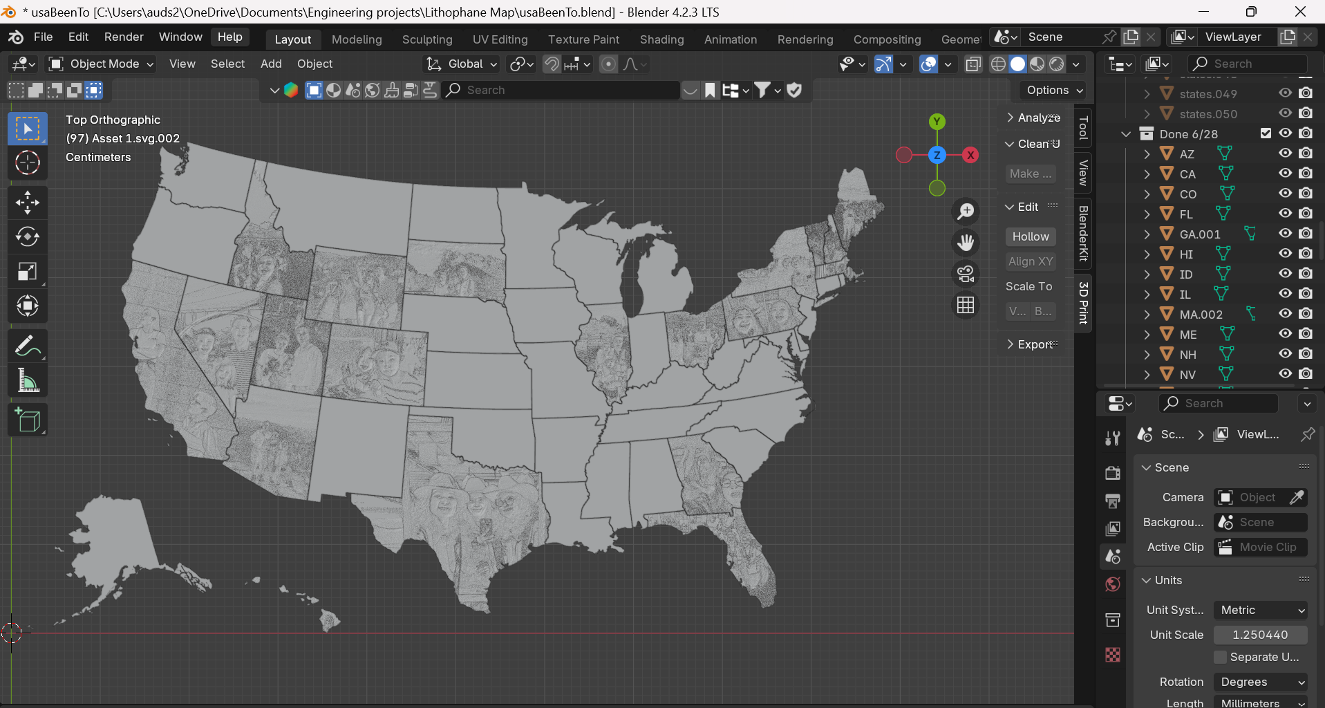 I first began by pulling a map of the US into Adobe Illustrator. I then pulled the SVG into Blender, then extruded them into a 3D shape, each with a thickness of 1/8”. I added gaps between each state so that there would be “wiggle room” between them and it’d be a less tight fit.